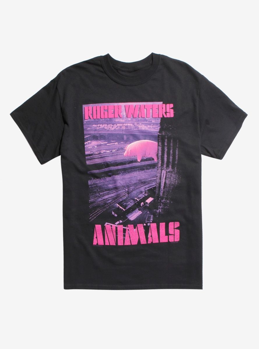 The Roger Waters Animals Tour T-Shirt is a striking piece of apparel that pays homage to the legendary musician and his iconic album “Animals.” This black t-shirt features a bold graphic print with a large pink pig floating above an industrial building, depicted in a monochromatic pink hue. Below the graphic, the word “ANIMALS” is prominently displayed in bold, capitalized pink letters.