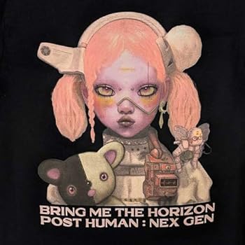 Elevate your wardrobe with this striking Bring Me the Horizon "Nex Gen Cover" unisex T-shirt. This black tee features eye-catching artwork from the band's "Post Human: Nex Gen" era. The front design showcases a central figure with vibrant pink hair styled in pigtails, donning a futuristic helmet, surrounded by eclectic elements including a panda-like stuffed animal and a small robot. Below the dynamic artwork, the bold text reads: "BRING ME THE HORIZON POST HUMAN: NEX GEN."