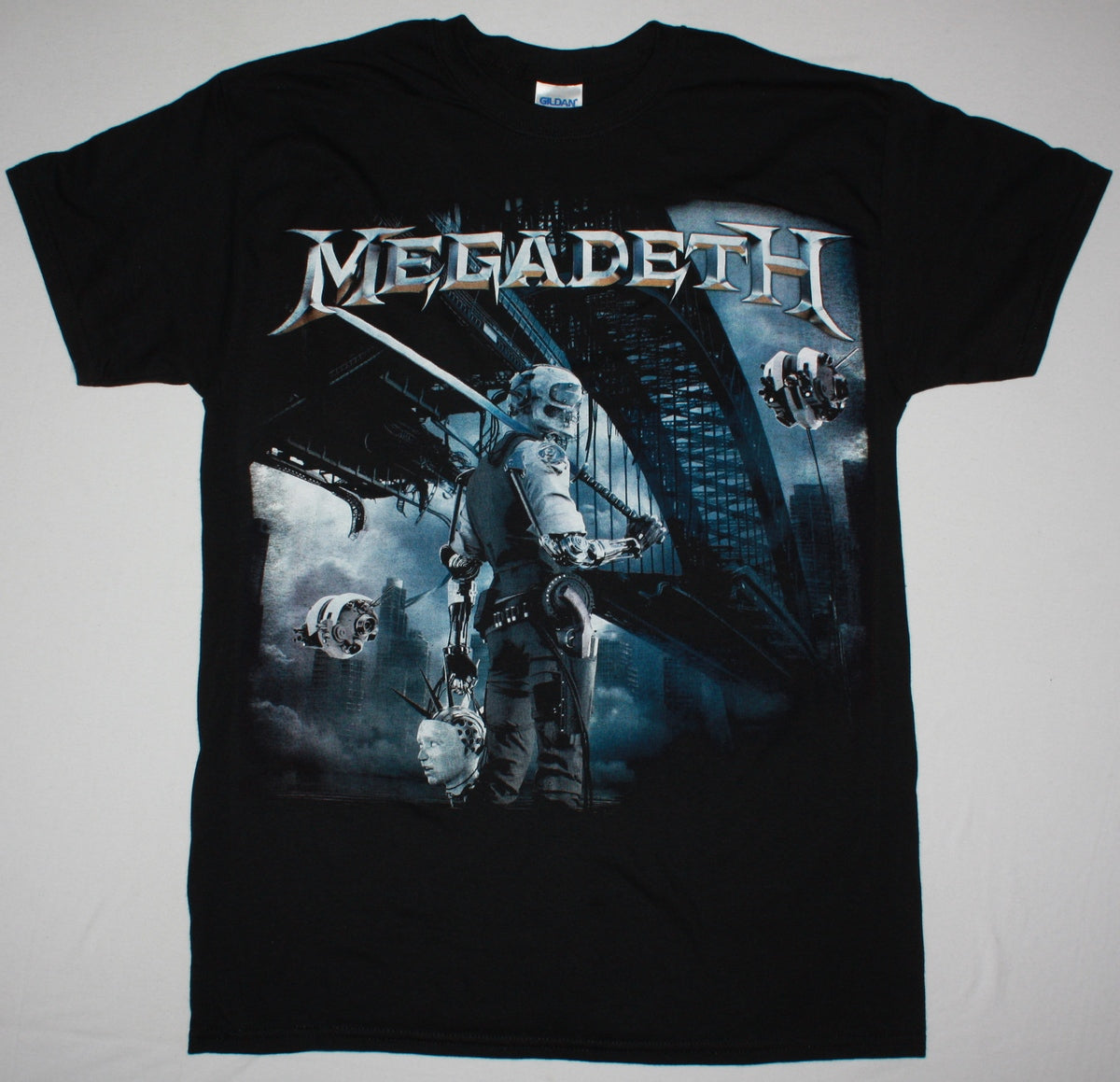 Rock in style with this Megadeth "Dystopia" T-Shirt. This black tee showcases the band’s name "MEGADETH" in bold, metallic text across the chest. The centerpiece is an intricate graphic from the "Dystopia" album, featuring cybernetic figure brandishing weapon, standing under an imposing industrial bridge. The dark, stormy background and futuristic cityscape amplify the dystopian vibe, making this shirt must-have for any heavy metal fan. Perfect for concerts, casual wear, or adding statement piece to your rock collection, this high-quality t-shirt offers both comfort and durability.