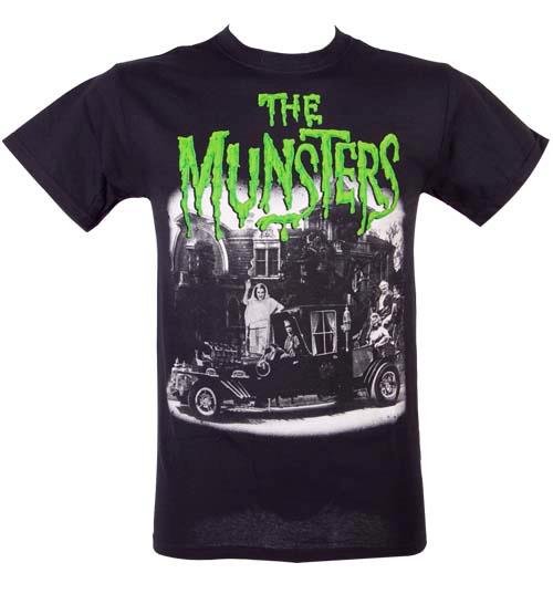"Large Licensed Munsters 'Rod & House' T-Shirt: Black tee with a vibrant graphic showcasing 'The Munsters' in green dripping font, and an iconic scene featuring the Munster Koach and spooky mansion. Perfect for fans of the classic TV show!"
