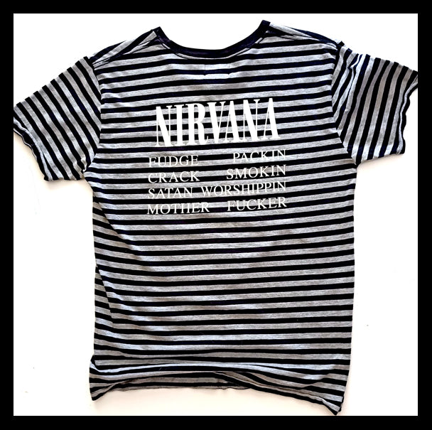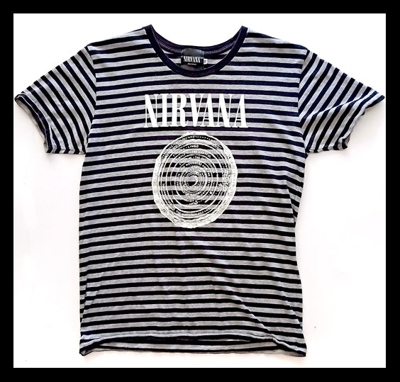 "Rock a classic grunge look with this licensed medium-sized Nirvana 'Fudge' T-shirt. This tee features a bold black and gray horizontal striped pattern with the iconic 'NIRVANA' text prominently displayed in large white letters across the chest. The circular graphic design below the text adds an edgy touch. Made from high-quality fabric, it ensures comfort and durability, perfect for concerts, casual outings, or adding to your rock memorabilia collection. Stand out in style and show your love for Nirvana's legendary legacy with this unique tee. Available in MEDIUM ONLY—order yours today!"