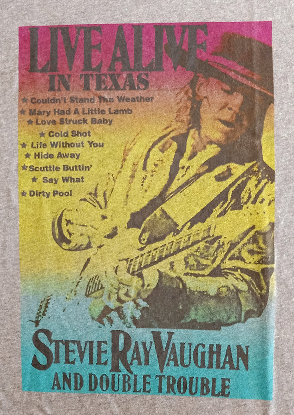 • Design: Vibrant graphic of Stevie Ray Vaughan with “Live Alive in Texas” text and song list